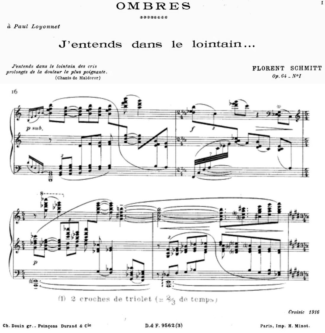 Several months later, I discovered that a forgotten composer named Florent Schmitt used a fractional meter in 1906 in "La tragédie de Salomé," although the fraction was 3 and a half; subsequently, in 1909, Charles Ives used 4 and a half in his "Piano Sonata No. 1," and Edgar Varese used 3 and a half in 1921 in his "Offrandes." However, by 1916, Schmitt had used partial triplets in two measures of his Opus 64, "Ombres," as shown below: